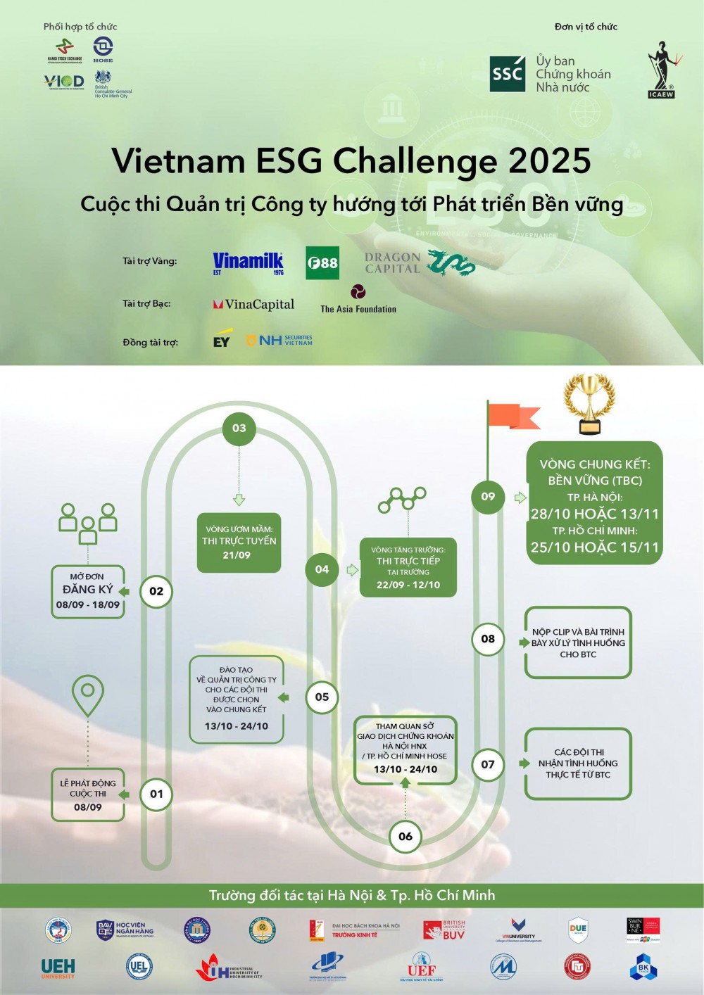 Cuộc thi do Ủy ban Chứng khoán Nhà nước Việt Nam và ICAEW tổ chức, dành cho sinh viên tại Hà Nội, Đà Nẵng và TP.HCM. Cuộc thi mang lại cơ hội thực tập, học bổng và giúp sinh viên tiếp cận xu hướng ESG – một lĩnh vực đang cực kỳ được quan tâm.